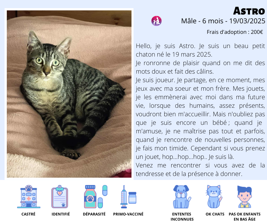 Vous voulez adopter Astro ? Merci de bien prendre connaissance de toutes les informations à son sujet et de remplir le formulaire prévu à cet effet en remplissant le formulaire suivant : cliquez ici.