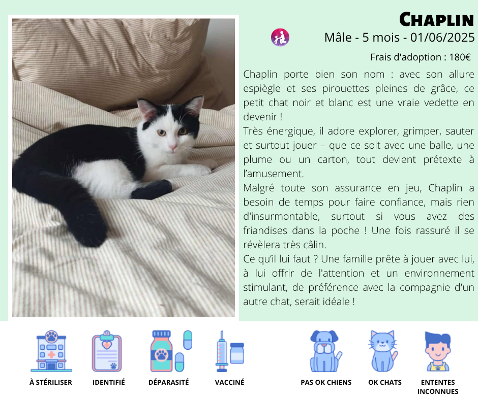 Vous voulez adopter Chaplin ? Merci de bien prendre connaissance de toutes les informations à son sujet et de remplir le formulaire prévu à cet effet en remplissant le formulaire suivant : cliquez ici.