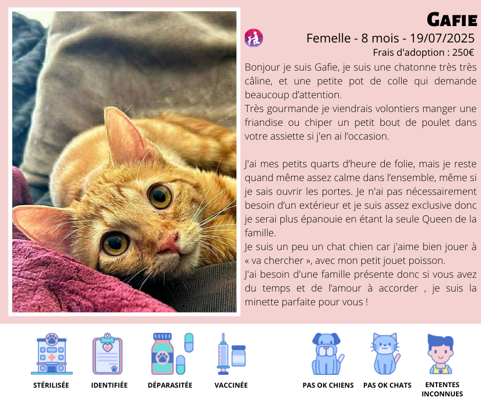 Bonjour je suis Gafie, je suis une chatonne très très câline, et une petite pot de colle qui demande beaucoup d’attention.