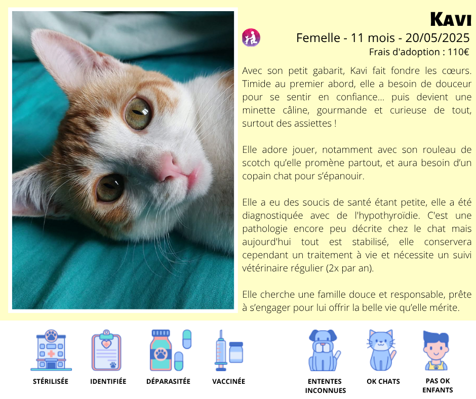 Avec son petit gabarit, Kavi fait fondre les cœurs. Timide au premier abord, elle a besoin de douceur pour se sentir en confiance… puis devient une minette câline, gourmande et curieuse de tout, surtout des assiettes !
