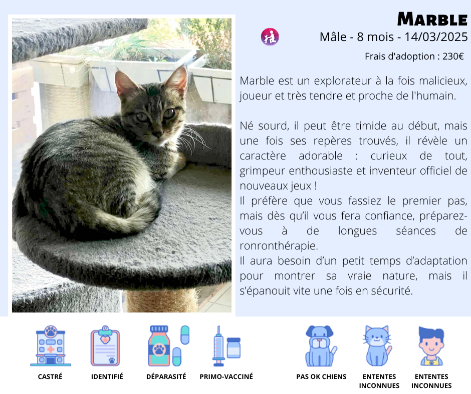 Vous voulez adopter Marble ? Merci de bien prendre connaissance de toutes les informations à son sujet et de remplir le formulaire prévu à cet effet en remplissant le formulaire suivant : cliquez ici.