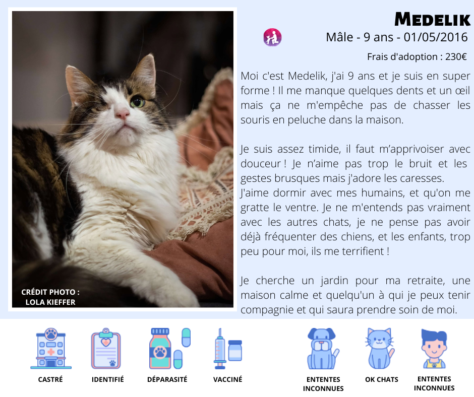 Vous voulez adopter Medelik ? Merci de bien prendre connaissance de toutes les informations à son sujet et de remplir le formulaire prévu à cet effet en remplissant le formulaire suivant : cliquez ici.