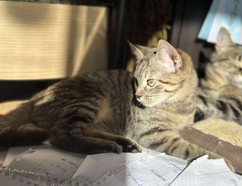 Côté humains, Oups reste encore un peu méfiante. Elle observe beaucoup, s’approche volontiers, mais préfère garder sa bulle de confort. Elle n’aime pas trop être caressée ni manipulée, mais apprécie la présence tranquille à vos côtés : elle s’installe volontiers sur le canapé ou près de vous pendant vos moments de télétravail.