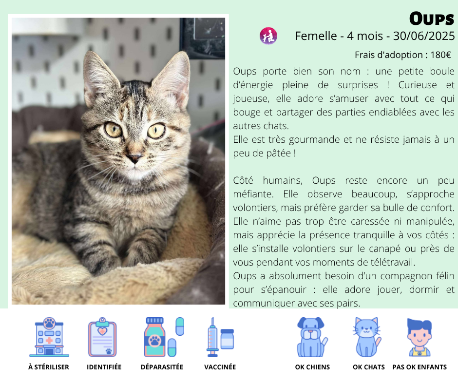 Oups porte bien son nom : une petite boule d’énergie pleine de surprises ! Curieuse et joueuse, elle adore s’amuser avec tout ce qui bouge et partager des parties endiablées avec les autres chats.