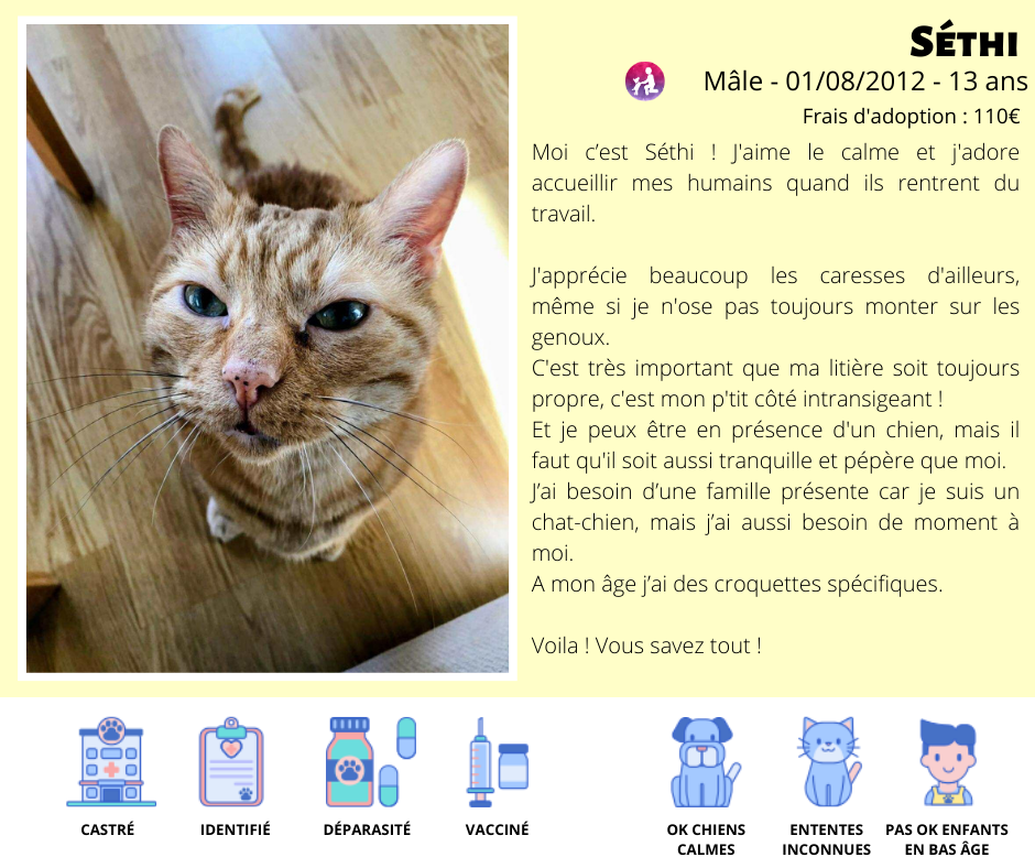 Vous voulez adopter Séthi ? Merci de bien prendre connaissance de toutes les informations à son sujet et de remplir le formulaire prévu à cet effet en remplissant le formulaire suivant : cliquez ici.