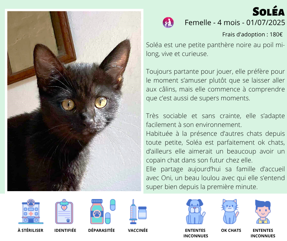 Habituée à la présence d’autres chats depuis toute petite, Soléa est parfaitement ok chats, d’ailleurs elle aimerait un beaucoup avoir un copain chat dans son futur chez elle.
